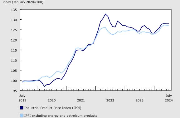 The annual figure for June was slightly revised up to a gain of 2.9%, from an increase of 2.8%. The biggest contributors to the year-on-year increase in July were unwrought gold, silver, platinum group metals and their alloys which gained 25.3%, while unwrought aluminum and aluminum alloys rose 26.3%. On a monthly basis, however, IPPI remained unchanged in July compared to the previous month. The monthly IPPI figure for June was revised down to a decline of 0.1% from no change. Higher prices for energy and petroleum products, which rose 2%, were offset by lower prices for lumber and other wood products that fell 3.4%, Statistics Canada said in a statement. "Excluding energy and petroleum products, the IPPI declined 0.2%," it added. Source: statcan.gc.ca |