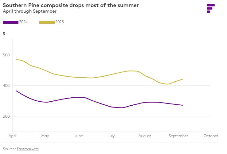 Southern Pine dimension mills have attempted to keep supplies more in line with sluggish lumber demand in recent months, but perceptions remain mixed whether it has ultimately been effective in tempering downward price pressure. Several mills reportedly curtailed production through the summer months without making public announcements to indicate cutbacks. Most of the measures were modest, often limited in scope to simply reducing shifts, according to sources. Temporary shutdowns are much less disruptive now at mills with newer technology, which allows for smoother transition from going idle to ramping up again. It tends to be more difficult for older mills ¨C often operated by smaller companies ¨C to take the same approach. The impact on supplies has been slowly realized throughout the distribution pipeline. In recent weeks, sources have reported tightening availability and fewer buildups. It has become increasingly challenging to procure highly mixed specified tallies that can ship within a week or sooner. Production curtailments by Western S-P-F mills have also contributed to rebalancing supplies and demand, as buyers in northern-tier markets who purchase both species have encountered dwindling availability. However, some SYP traders are unsure whether the quiet production cutbacks have had any true effect on the overall market. New mills in some producing zones came online in early summer and ramped up output while working out potential bugs that might have surfaced in their systems. Other traders are quick to highlight the extent of fading consumption from the housing sector. ¡°It just seems we¡¯re still where we were,¡± one source said regarding supplies and demand. ¡°There¡¯s just no fear in the marketplace.¡± After a slight bump in prices in July, the Random Lengths Southern Pine Composite has trended down for most of August and September. Sales have picked up modestly in recent weeks, and narrow widths have stabilized or posted minor increases. Source: fastmarkets.com |