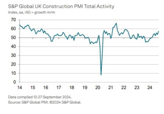 New work ¡°also expanded markedly, with rising demand attributed to increased willingness-to-spend among clients and a more supportive economic backdrop.¡± Accordingly, the headline S&P Global UK Construction Purchasing Managers¡¯ Index (PMI) ¨C a seasonally adjusted index tracking changes in total industry activity ¨C posted 57.2 in September, up from 53.6 in August and above the neutral 50.0 threshold for the seventh successive month.