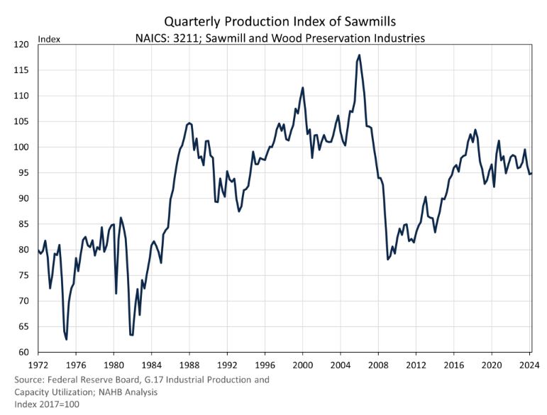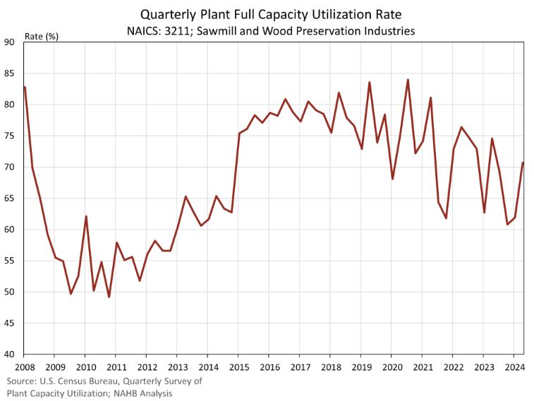 ![]() The production index for sawmills and wood preservation industries rose marginally by 0.2% in the second quarter of 2024. After falling for the previous two quarters, this was the first rise in real output since the third quarter of 2023 according to the G.17 data. The index was 2.2% lower than one year ago, the largest year-over-year decline since falling 4.7% in the fourth quarter of 2021. Quarterly Survey of Sawmills Capacity Utilization To provide a better understanding of the sawmill and wood preservation industries, the Census Bureau¡¯s Quarterly Survey of Plant Capacity Utilization is another source of interest. This data comes from quarterly surveys of U.S. domestic manufacturing plants and includes a subindustry grouping of sawmills and wood preservation firms. The survey estimates utilization rates based on full production capability, meaning the utilizations rates are found by taking the market value of actual production during the quarter and dividing by an estimated market value of what the firm could have produced at full production capacity. In other words, the rate indicates how much production capacity is used to produce current output. Source: eyeonhousing.org |