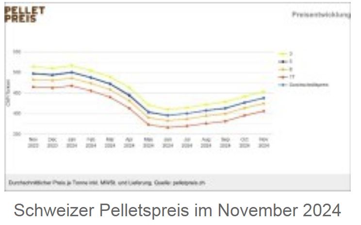 • Swiss pellet price in November 2024 with purchase of 17 tonnes: 405.73 Swiss francs
