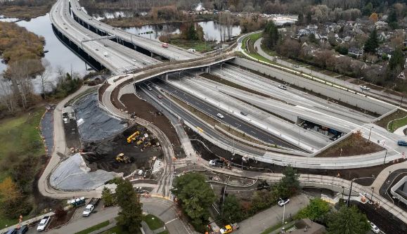 Aerial view of the east end of the State Route 520 Montlake interchange in Seattle on Dec. 5 where crews worked to complete connections to a new bike and pedestrian bridge over the highway. Courtesy of Washington state DOT