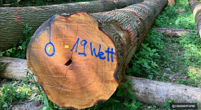 16 buyers from Germany, Austria, France and the Netherlands took part in the tender. Particularly noteworthy is the top log from the H¨ıttenberg municipal forest, which realised a total value of €8,758 with a price of €3,020 per cubic metre and a volume of 2.9 cubic metres. The most valuable single log came from the Altenhaßlau court forest and was sold for an impressive €10,400 (3.5 fm at €3,000/fm) - both logs went to the same German veneer manufacturer.