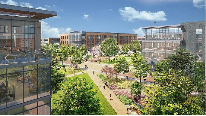 The 25-building development for 15,000 workers will incorporate office, retail and a hotel, as well as parking structures, fitness center, amphitheater, childcare facilities ¡ª and a lake. About half of the project acreage is slated for green space, with seven miles of hike and bike trails, including elements of the Razorback Regional Greenway.
