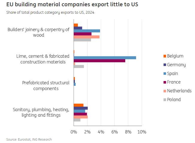 Many building materials, such as concrete, bricks, and cement, are heavy and thus costly to transport, resulting in limited exports from the EU to the US. For most building material categories from EU countries, less than 3-4% is exported to the US. Only France and Spain have a higher share of their exports to the US for lime, cement, and fabricated construction materials. However, the exported volumes remain low. For example, French building material suppliers exported only €55m worth to the US in 2024.