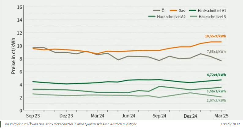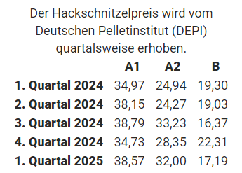 The price for wood chips (quality class A2) is according to the German Pelletinstitut (DEPI) in Q1 2025 increased by 12.9% compared to the previous quarter. The average price is now 32.00€/Srm net or 32.00€/Srm for a decrease of 80 bulk volume meters (Srm). 3,56 ct/kWh.