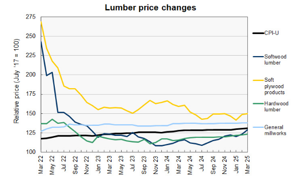 Softwood lumber prices surged higher in March on top of its jump last month. It rose 7.6 percent between the January and March reports. The quoted market price of lumber continued its sharp upward movement for the month of March, rising another 6.5 percent from its level on March 11 until it peaked on March 24. Since then, it has trended lower, closing on April 10 at 10.6 percent below its level on March 11.