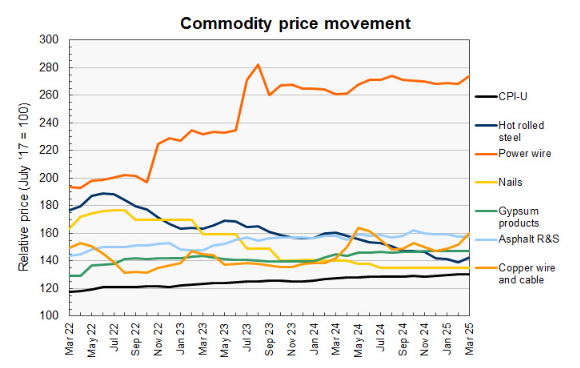 The price index for copper wire rose by the greatest percentage of the construction materials prices we track this month. Its price index is up 8.5 percent since its recent low in December. Looking at the underlying material price, the market price of copper rose 9.5 percent from its level on March 11 until reaching its recent high on March 26. It has fallen since then, closing on April 10 at 8.5 percent below its level on March 11. However, its price movements over the last few days have been to the up side.