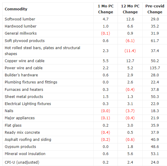 The next chart, below, shows the recent history of several other construction materials prices. These are relatively simple commodities whose prices are strongly driven by those of the materials of which they are comprised.