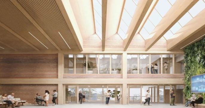The design of the facility is based on a four-storey timber framework supported by two concrete cores. Credit: Besix.